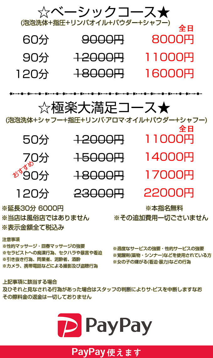 心と身体の癒しを目的としたオイル(リンパ)と指圧マッサージを提供しております。女の子に関しては容姿はもちろん性格・マナーには絶対の自信があります。必ず貴方好みの子が見つかります!皆様のご来店お待ちしております。 |